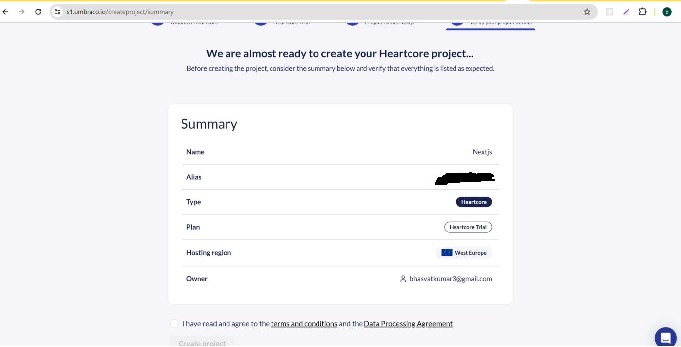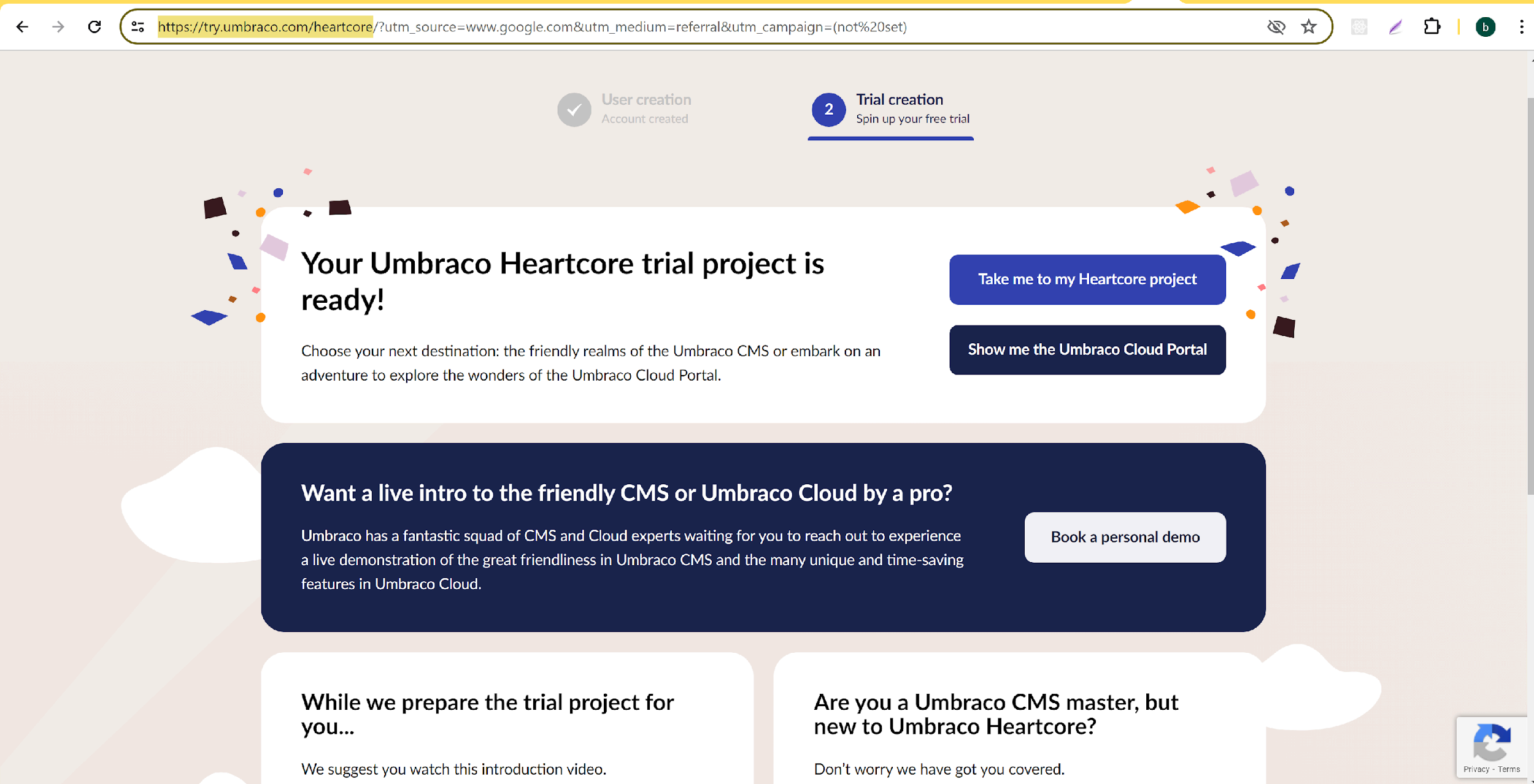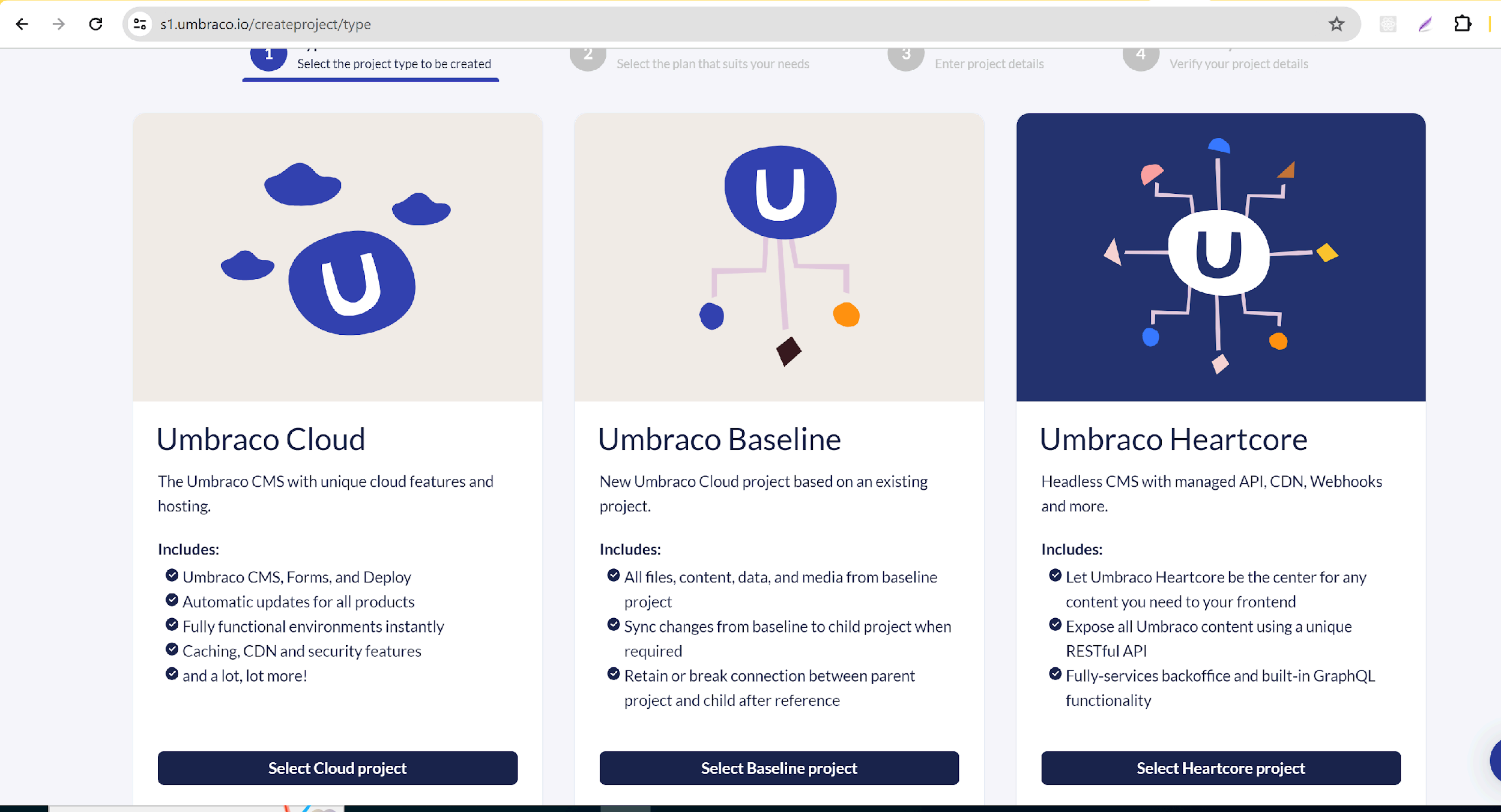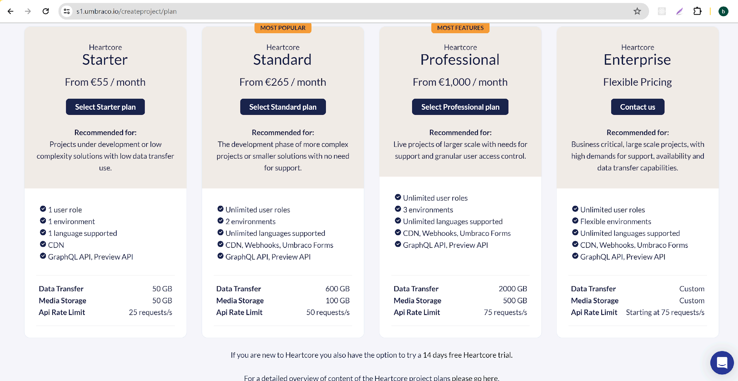 In the below screen select Umbraco Heartcore. After the selection you can see the next screen with pricing, ignore the pricing cards and go to the bottom click on 14 days free heartcore trial link.