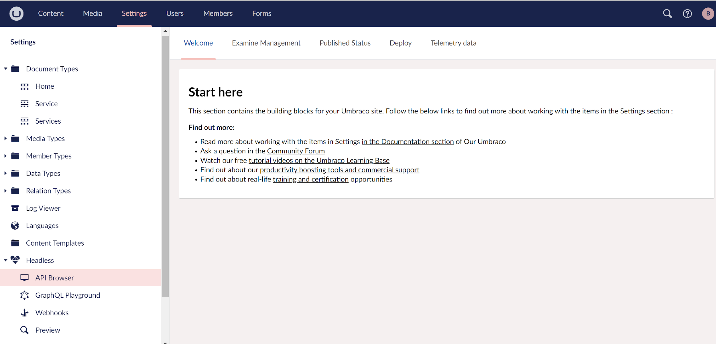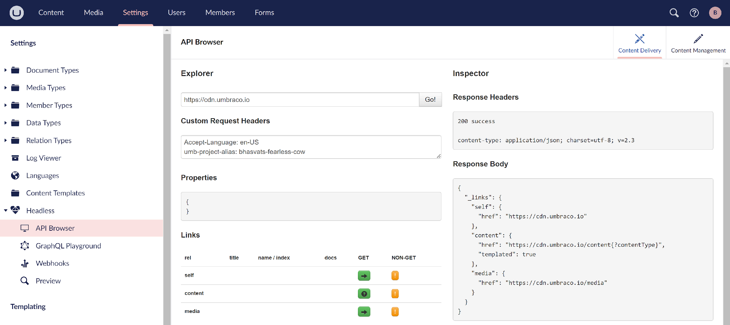Now go to the settings tab in the left hand side menu you can find the headless menu and open it. Here you can test content delivery api. Here umbraco heart core documentation.