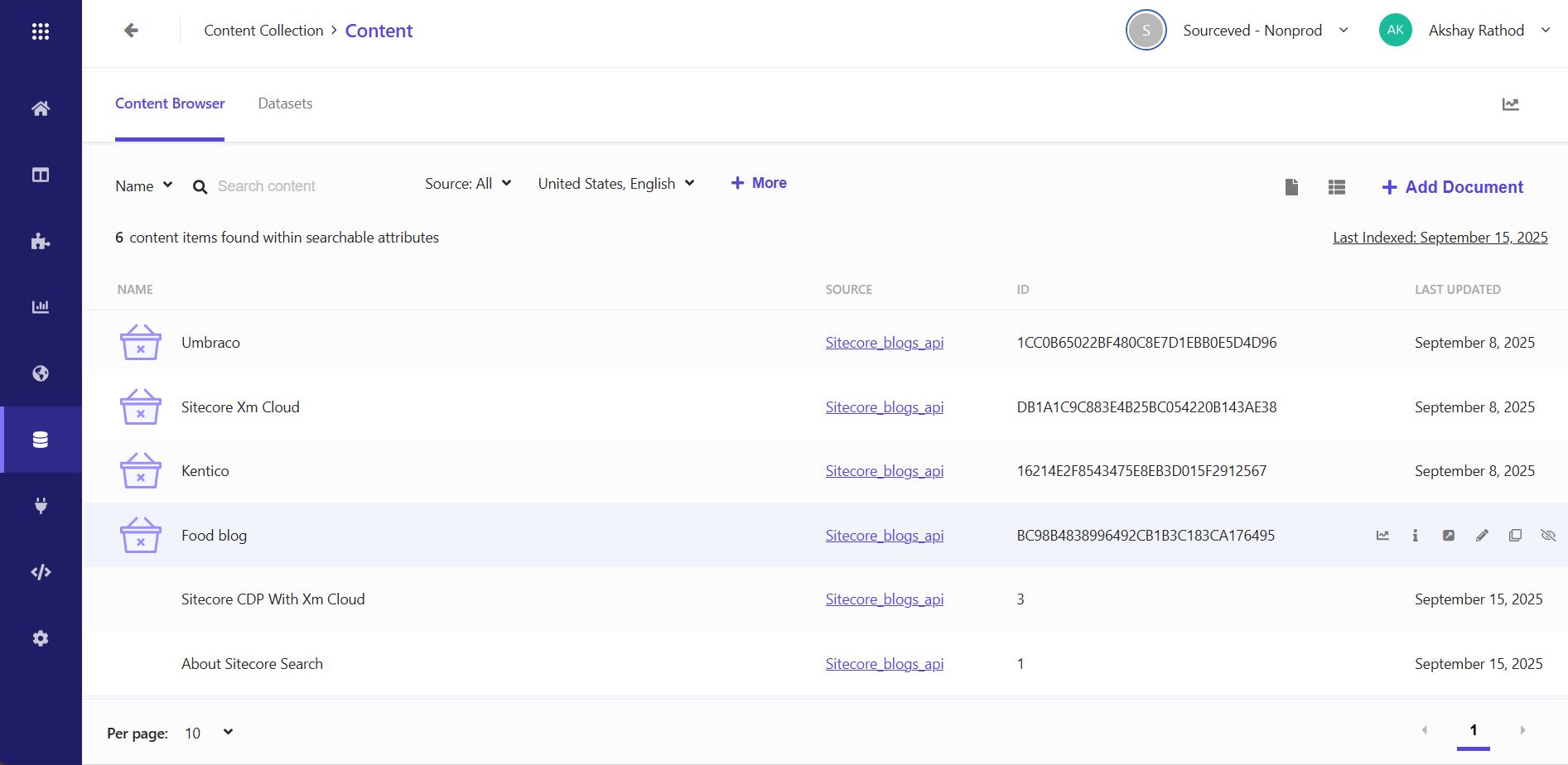 Additionally, we can view and manage our content items directly in the Sitecore Search dashboard under the Content Items section.