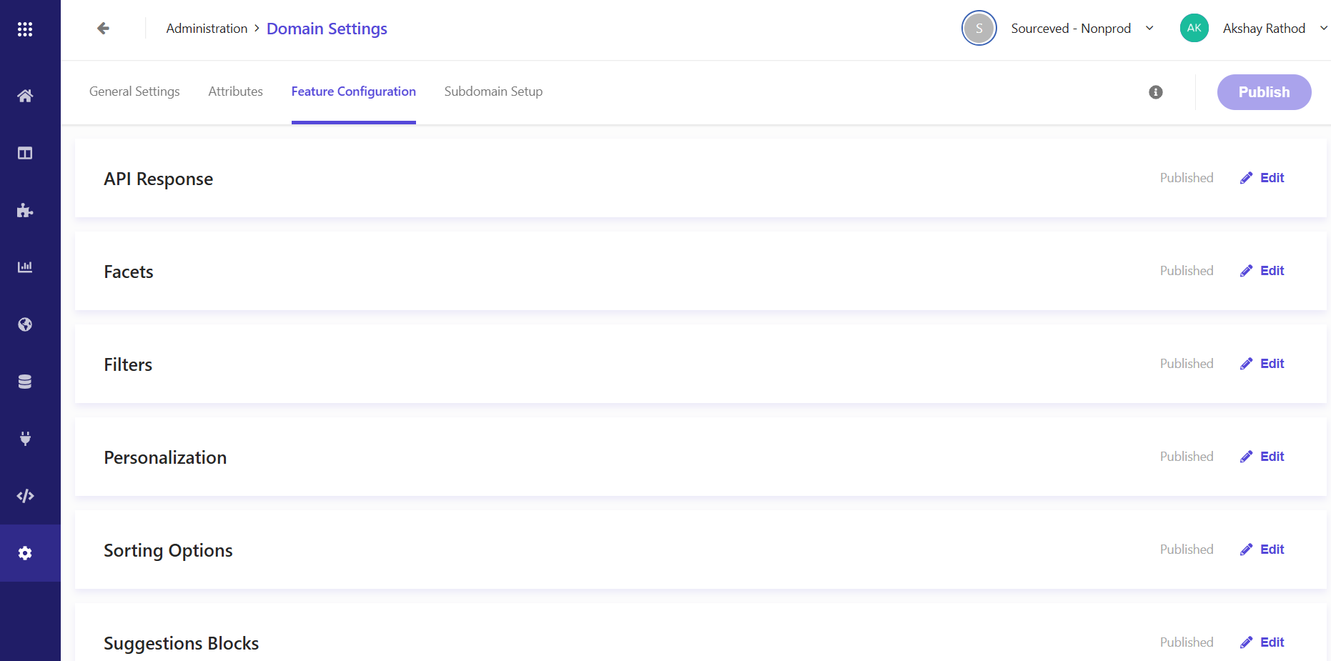 In Sitecore Search, these features can be configured from the Administrator panel under Domain Settings → Feature Configurations (as shown in the screenshot below).